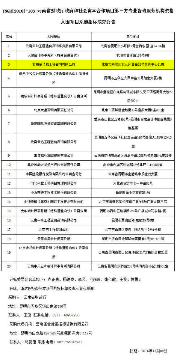 公司入圍云南省財政廳政府和社會資本合作項目