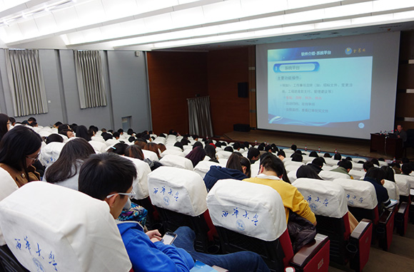 儀式結(jié)束后,周和生董事長為建筑與土木工程學(xué)院學(xué)生及相關(guān)部門工作人員作了題為“建設(shè)項(xiàng)目全過程投資管理及審計(jì)系統(tǒng)介紹”的學(xué)術(shù)報(bào)告。